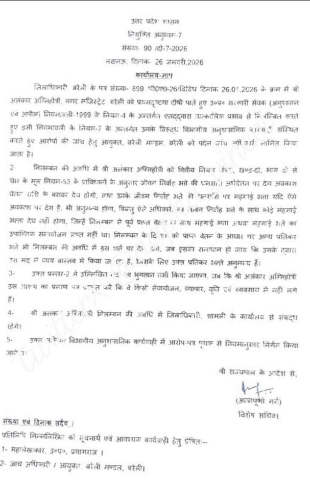 उत्तर-प्रदेश शासन नियुक्ति अनुभाग 7 से जारी आदेश में कहा गया है कि अलंकर अग्निहोत्री ने प्रथम दृष्टया अनुशासनहीनता की है। जिसके चलते तत्काल प्रभाव से उन्हें निलंबित किया गया है।