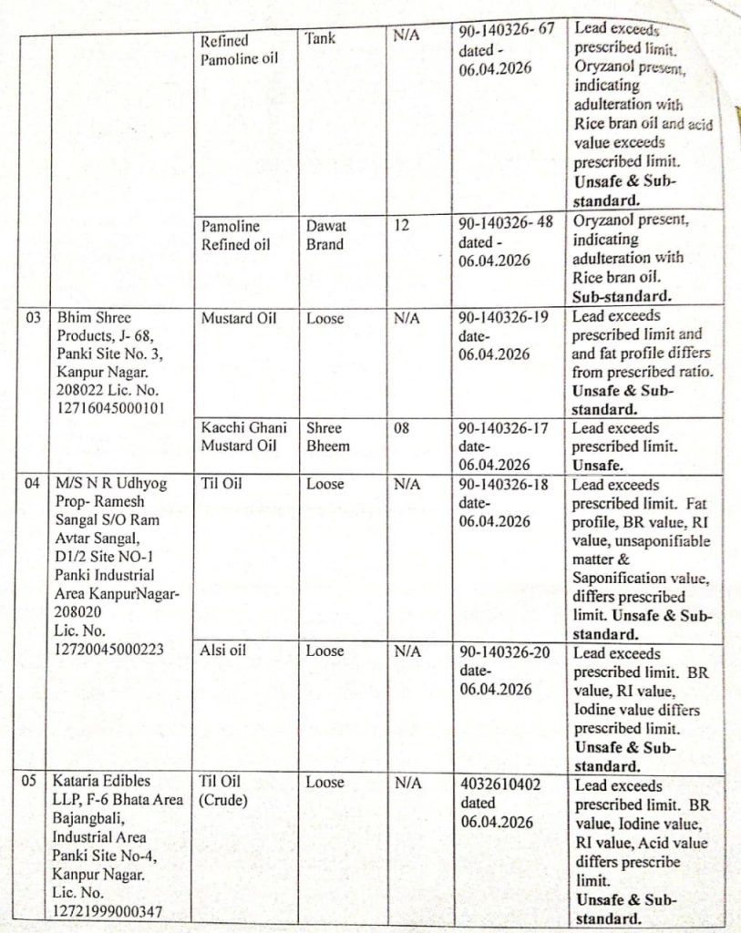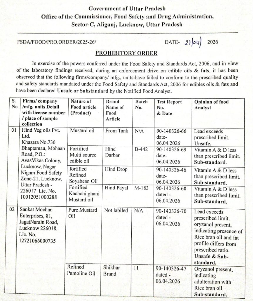 आयुक्त ने जारी पत्र में कहा है कि खाद्य सुरक्षा और मानक अधिनियम, 2006 की धारा 18(1)(a) के साथ पठित धारा 30(2)(a)तहत प्राप्त शक्तियों का प्रयोग करते हुए, तथा सार्वजनिक स्वास्थ्य और उपभोक्ता हित की सुरक्षा को ध्यान में रखते हुए संबंधित फर्मों/कंपनियों/विनिर्माण इकाइयों द्वारा निर्मित, ऊपर सूचीबद्ध उत्पादों (खाद्य तेलों और वसा) के निर्माण, बिक्री, भंडारण और वितरण को पूरे उत्तर प्रदेश राज्य में तत्काल प्रभाव से तब तक के लिए प्रतिबंधित किया जाता है। जब तक कि निर्माता द्वारा संबंधित उत्पाद (खाद्य तेलों और वसा) की गुणवत्ता अनुपालन सुनिश्चित करने हेतु सुधारात्मक उपाय नहीं कर लिए जाते।