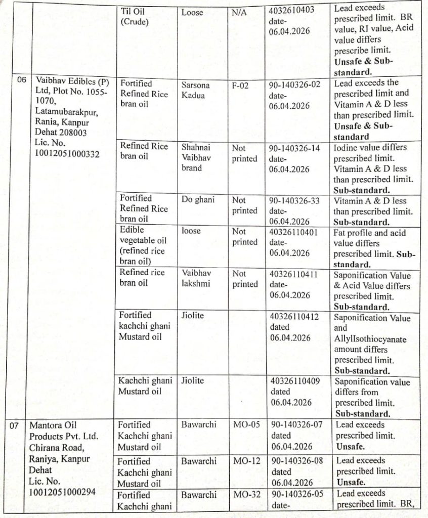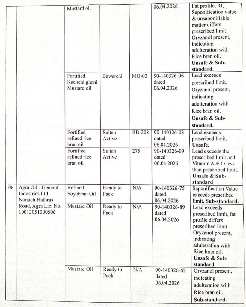 टेलीग्राम संवाद, लखनऊ। एफएसडीए आयुक्त डॉ. रोशन जैकब ने कहा है कि 14 सूचीबद्ध फर्मों/इकाइयों/कंपनियों ने खाद्य सुरक्षा और मानक अधिनियम, 2006 में उल्लिखित वैधानिक प्रावधानों और उसके तहत बनाए गए विनियमों का उल्लंघन किया है। विनिर्माण इकाइयों द्वारा तैयार खाद्य तेल के नमूने, उनमें सीसा (भारी धातु) की उपस्थिति के कारण, स्वास्थ्य के लिए हानिकारक पाए गए। नमूने विभिन्न मापदंडों पर भी निम्न-मानक पाए गए, जिससे यह संकेत मिलता है कि लेबल पर ऐसी कोई घोषणा किए बिना ही दो या अधिक खाद्य तेलों को आपस में मिलाया गया था। कुछ मामलों में, मानक मापदंडों से विचलन खाद्य तेल की गुणवत्ता में गिरावट का संकेत देता है। फोर्टिफाइड खाद्य तेल और वसा भी फोर्टिफिकेशन के मानकों के अनुरूप नहीं पाए गए। यह स्थिति सार्वजनिक स्वास्थ्य के साथ-साथ सार्वजनिक हित के भी विरुद्ध है और आम उपभोक्ताओं को धोखा देने का प्रमाण है।