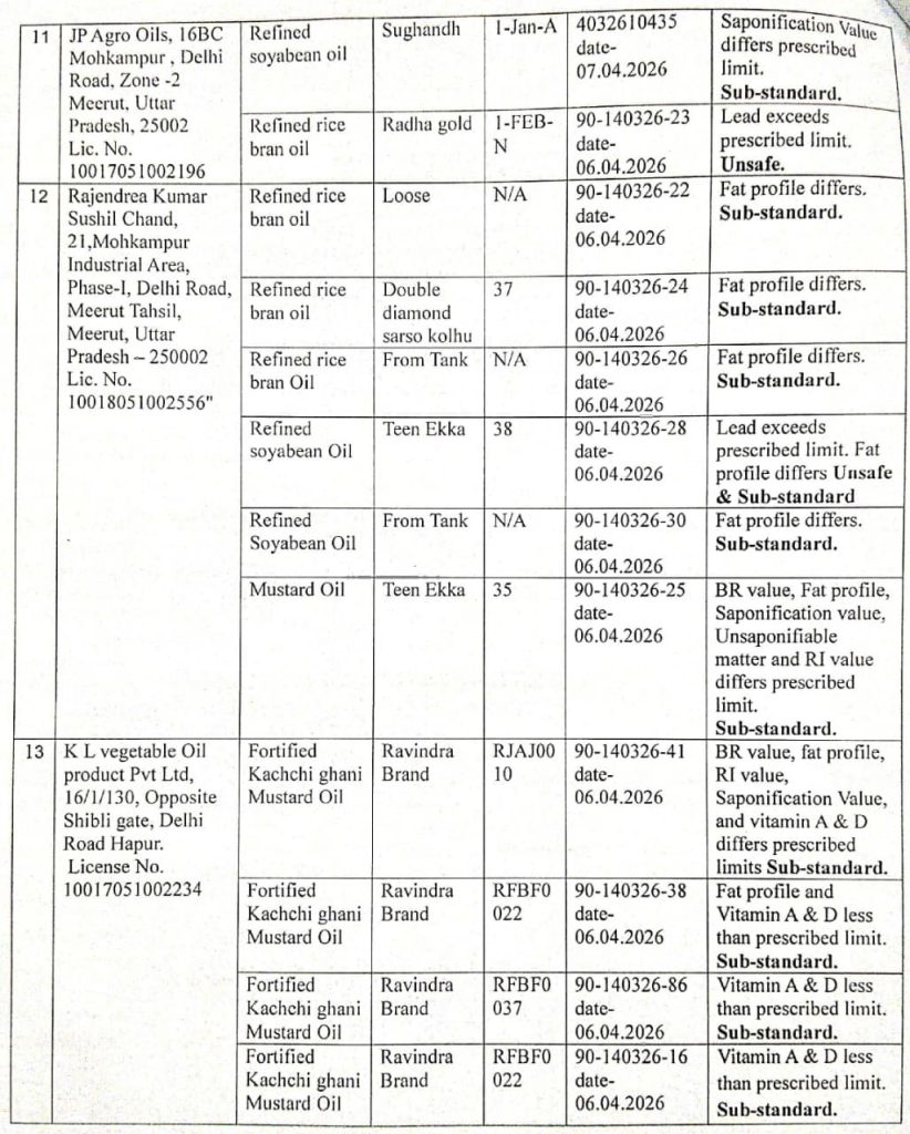 एफएसडीए आयुक्त डॉ रोशन जैकब ने निर्देश दिए हैं कि सूचीबद्ध उत्पादों (खाद्य तेलों और वसा) का निर्माण, बिक्री और वितरण तत्काल प्रभाव से बंद कर देंगे। उन्होंने कहा है कि अपने पास मौजूद स्टॉक की स्थिति की जानकारी संबंधित ‘पदनामित अधिकारी’ को 48 घंटों के भीतर दें। उन्होंने कहा कि असुरक्षित उत्पाद को बाजार से वापस (Recall) मंगाया जाए। इसे तत्काल प्रभावी माना जाए। पदनामित अधिकारी और खाद्य सुरक्षा अधिकारी इस आदेश अनुपालन को सुनिश्चित करने तथा सूचीबद्ध फर्मों/कंपनियों/विनिर्माण इकाइयों के खाद्य पदार्थों (खाद्य तेलों और वसा) आगे और प्रसार को रोकने हेतु कड़ी निगरानी रखेंगे। उन्होंने कहा है कि यह आदेश सार्वजनिक हित में एक एहतियाती रूप में जारी किया गया है और यह संबंधित खाद्य व्यवसाय संचालकों को खाद्य सुरक्षा और मानक अधिनियम, 2006 तथा उसके तहत बनाए गए नियम अंतर्गत प्रदत्त ‘पुनः-विश्लेषण’ (Re-analysis) वैधानिक अधिकार लाभ उठाने से वंचित नहीं करता है।
