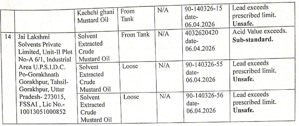 एफएसडीए द्वारा 20 दिन पहले चलाए गए विशेष अभियान में एक जिले की टीम दूसरे जिलों में लगाई गई थी। यानी क्रास चेकिंग से सैंपलिंग की गई थी। ऐसा लगता है कि टीम ने दबाव में अथवा खानापूर्ति के लिए सैंपलिंग की थी। क्योंकि गोरखपुर स्थित जय लक्ष्मी साल्वेंट फैक्ट्री से तीन (एक सीधे टैंक से और दो खुले तेल) नमूने भरे थे। तीनों नमूने सरसों तेल क्रूड ऑयल था। सल्वेंट फैक्ट्री में जिस स्टॉक से टीम ने नमूने भरे वो फिनिशिंग स्टेज पर नहीं था। उसकी सफाई और प्रोसेसिंग भी नहीं हुई थी। कुल मिलाकर क्रूड ऑयल सीधे तौर पर खाने योग्य नहीं था। फिर भी टीम ने नमूने ले लिए, जो लैब में अनसेफ पाए गए। लैब जांच में साल्वेंट क्रूड मस्टर्ड ऑयल हैबी मैटेरियल (लैड) पाया गया। खाद्य पदार्थ विशेषज्ञों का कहना है कि लैब में भारी मैटेरियल यानी लैड कैसे डिटेक्ट हुआ। उनका कहना है कि यह पहली बार ऐसा हुआ है। मजे की बात यह है कि टीम ने एक ऐसी फैक्ट्री से सैंपल भर लिया, जो पिछले तीन-चार सालों से बंद पड़ी है। उसमें उत्पादन हो नहीं रहा है। लैब में उसका नमूना फेल भी हो जाता है। रिपोर्ट में उसे असुरक्षित और अधोमानक घोषित कर फर्म प्रतिबंधित भी कर दी जाती है।